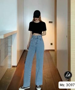 Quần jean ống rộng nữ cạp cao 2 nút màu xanh nhạt kiểu khuyên lưng